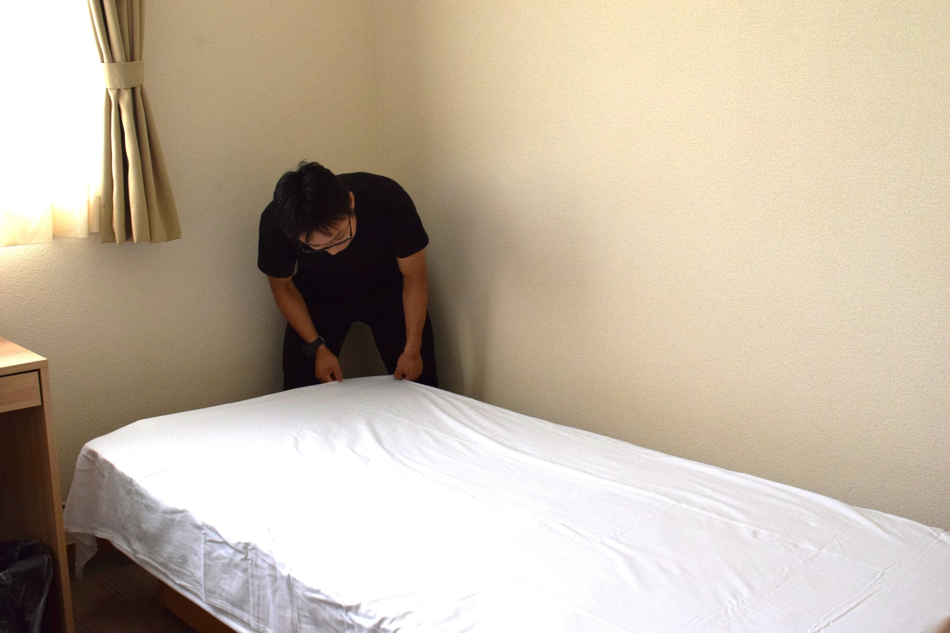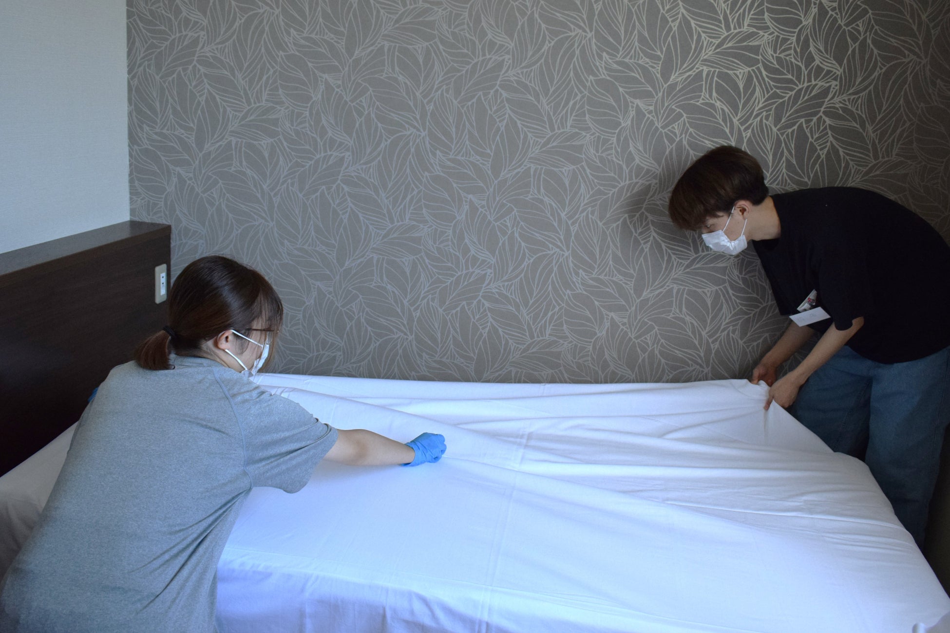 ▼双葉郡浪江町「ホテル双葉の杜」客室のベッドメイキングをする参加者(2023/08/19撮影)