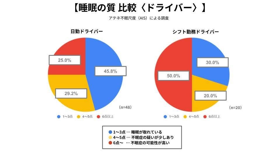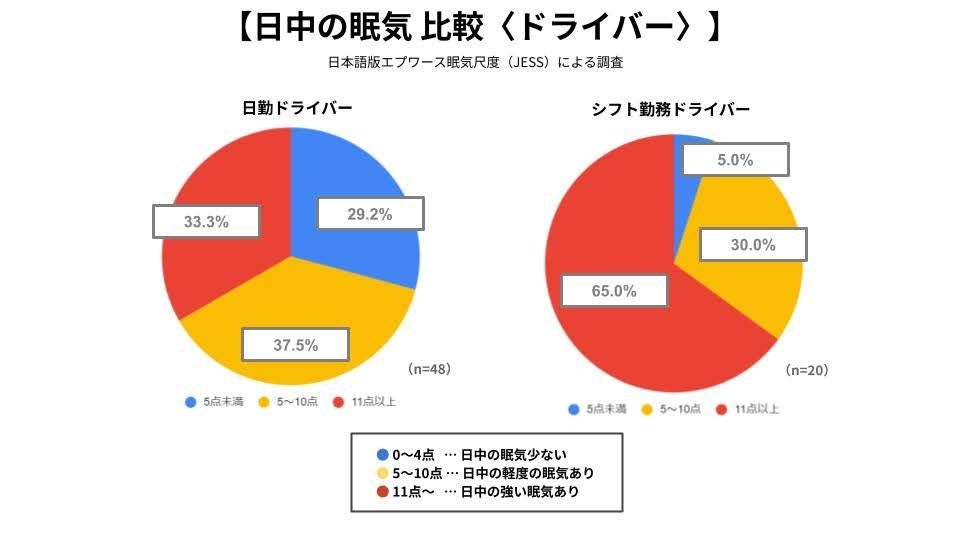 シフト勤務ドライバーは、日勤ドライバーと比較して睡眠の質が低く、日中の眠気が強い人が多いことが明らかに