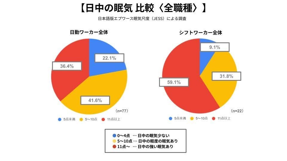 日中の眠気を評価するために臨床現場でも利用される「エプワース眠気尺度」(質問票)を用いて得た回答を集計しました。その結果、11点以上の「日中の強い眠気あり」に該当したのは、日勤ワーカーと比べてシフトワーカーの方が22.7ポイント高くなりました。ドライバー職で比較するとその差はさらに大きく、シフト勤務ドライバーが31.7ポイントも高いという結果となりました。