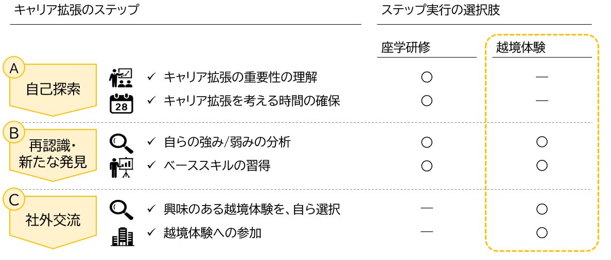 こうした状況を踏まえ、今回の実証実験では座学研修に越境体験を組み合わせ、新たな研修のあり方によるキャリア拡張の可能性を検証していきます。