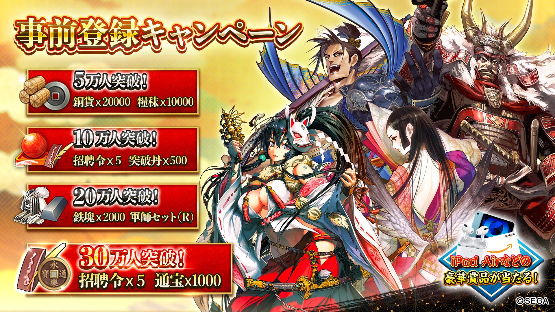 事前登録者数20万人突破 - 鉄塊×2000、軍師セット(R)×1