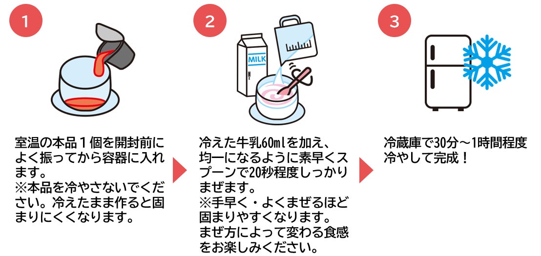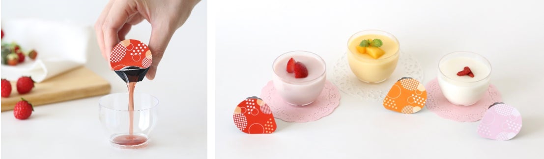 牛乳と混ぜるだけで、ぷるぷる食感のプチデザートが簡単に作れます。ポーション容器に入った個包装で、好きな時に食べたい分だけ作れるのがポイントです。いちご・マンゴー・杏仁の3種類の味をご用意しました。お子さまから大人まで、幅広い世代にお召し上がりいただける甘くやさしい味わい。ポーション1個と牛乳60mlでデザートカップ約1杯分が作れる仕様となっており、一人暮らしの方や、ご家族でそれぞれ好きな味を選びたい方、お子さまの分だけ作りたい方などにオススメです。食後のデザートや、お子さまのおやつにどうぞ。