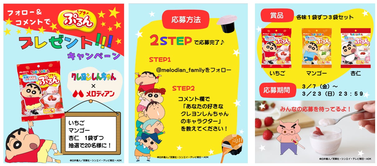 メロディアンの公式アカウント(@melodian_family)をフォローし、キャンペーン投稿に「クレヨンしんちゃんの好きなキャラクター」をコメントすると、抽選で20名様