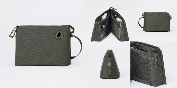 ・三角形状で、立てて使えて、開くとメッシュファスナーポケットで中が一目でわかりやすい。