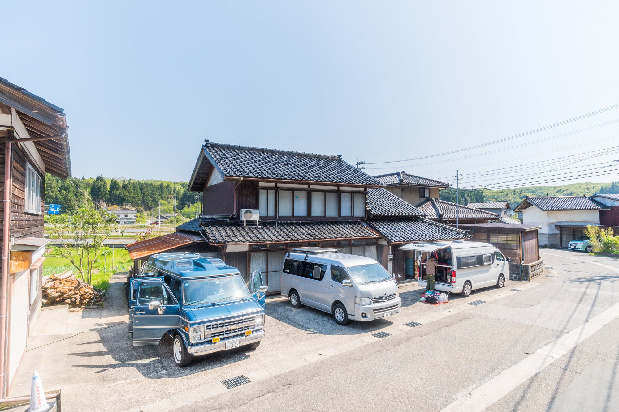 「田舎バックパッカーハウス」駐車場に、車中泊仕様の車を“部屋”として、家にドッキング/駐車させ、シェアハウス内のワークスペース(Wi-Fiやパソコンモニター付き)、リビング、キッチン、シャワー、畑など、生活で必要となるスペースや設備の共同利用も可能です。