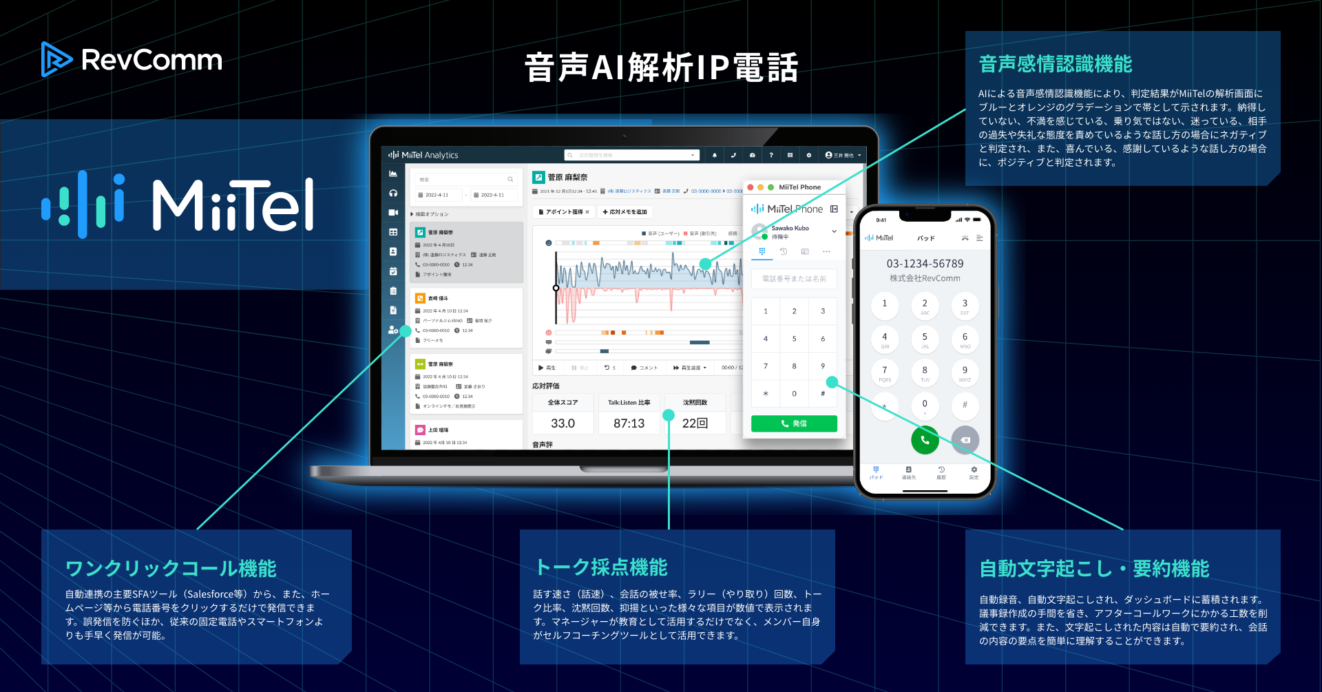下記ご紹介の通り、AI搭載ヘッドセット「MTLAF040122」の機能は、現在企業におけるコミュニケーションで1,250社、3万人に活用されている音声解析AI電話「MiiTel」の進化系です。今後もコミュニケーションの劇的な進化を目指し、「MiiTel」の新機能開発を進めていきます。RevCommはこれからも「コミュニケーションを再発明し人が人を想う社会を創る」というミッションのもと「MiiTel」の提供価値向上に努め、企業の生産性向上に貢献してまいります。