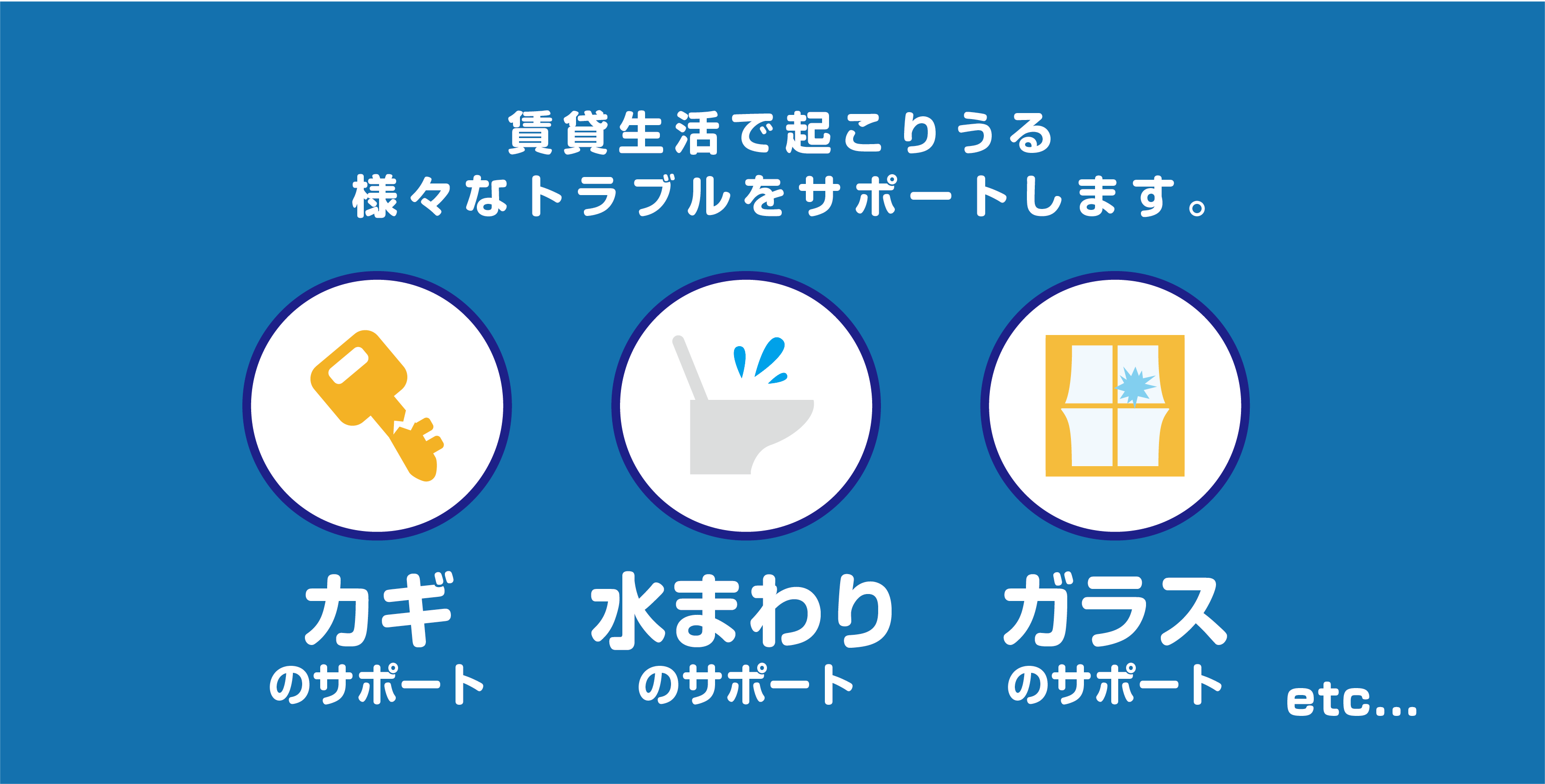 入居者様の日常生活において起こり得る「カギを無くした」、「トイレがつまった」、「ガラスが割れてしまった」等の様々なトラブルを24時間体制でサポートいたします。