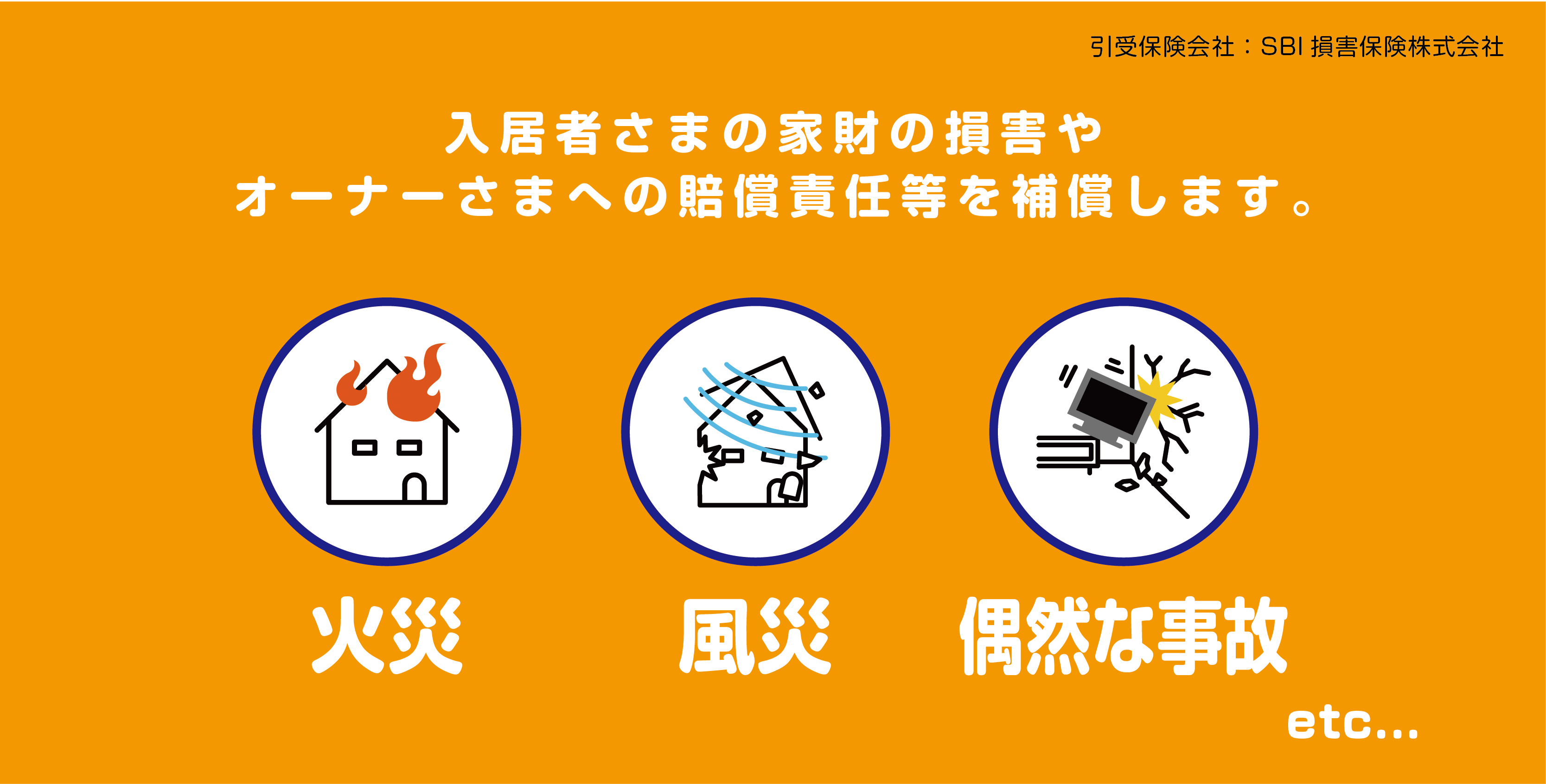 賃貸住宅にお住いの皆様の家財を火災、風災、水災、盗難、水漏れ等による損害や日常生活で生じる様々な法律上の損害賠償責任の補償に加え、汚損時に物件の修繕や清掃時にかかる費用も補償いたします。