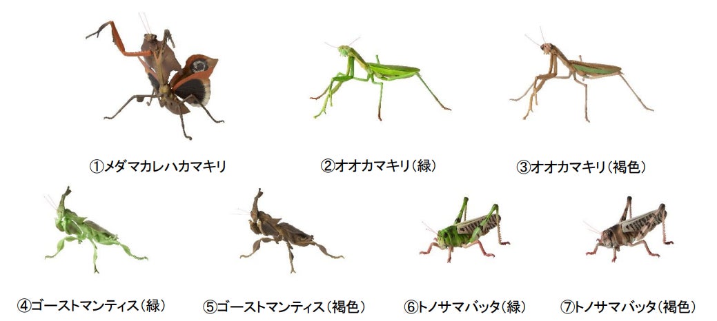 本商品は、造形と色彩にこだわった「いきもの大図鑑ミニコレクション」シリーズの昆虫第2 弾です。標本を CT スキャンにかけているため、小さくても本物そっくり。今回はカマキリ中心に「メダマカレハカマキリ」、「オオカマキリ (緑)」、「オオカマキリ(褐色)」、「ゴーストマンティス(緑)」、「ゴーストマンティス(褐色)」、「トノサマバッタ(緑)」、「ト ノサマバッタ(褐色)」の全 7 種をラインアップ。