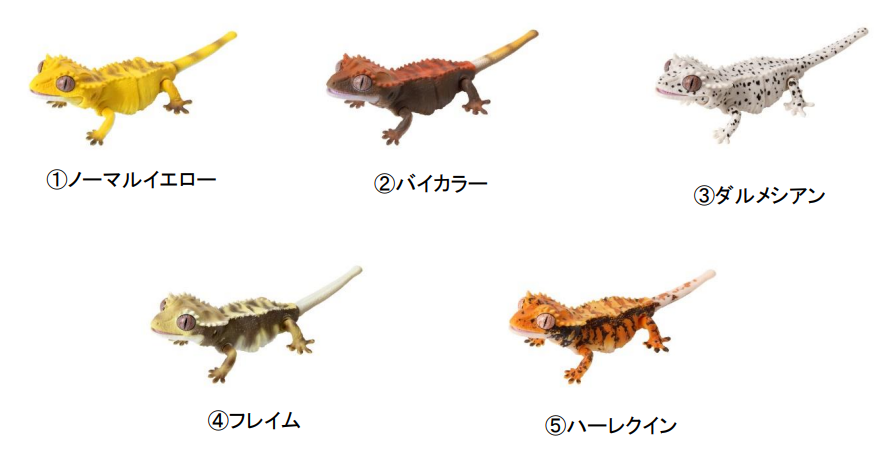 本商品は、レオパードゲッコーと並んで人気のクレステッドゲッコーをかわいくデフォルメしたフィギュアです。サイズは本物のクレステッドゲッコーより少し小さめの全長 100mm。口や脚、尻尾など可動箇所は全 8 箇所あるため、好きなポーズをとらせることができます。特徴的なカラーや模様がない「ノーマルイエロー」、背中と側部のカラーが異なる「バイカラー」、体に約 10 個以上斑点のある「ダルメシアン」、背中にタイガー・側部に無地もしくは炎のような模様がある「フレイム」、側部や手足に炎・背中にタイガーのような模様がある「ハーレクイン」の全 5 種を ラインアップ。