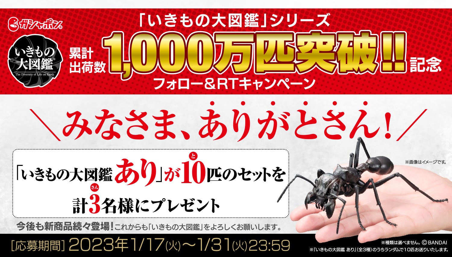 | キャンペーン名称 | 「いきもの大図鑑」シリーズ累計出荷数 1,000 万匹突破ありがとさん! Twitter キャンペーン |
