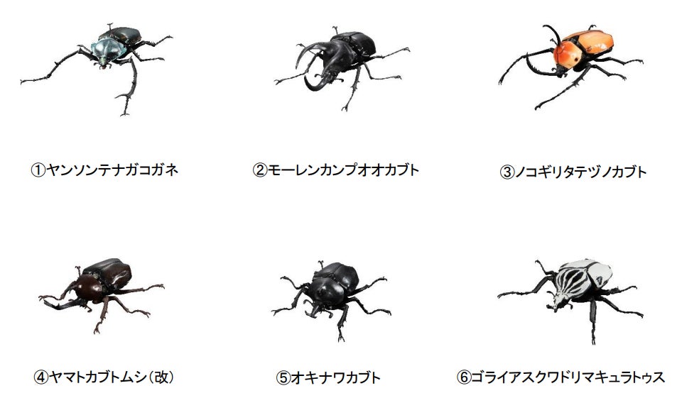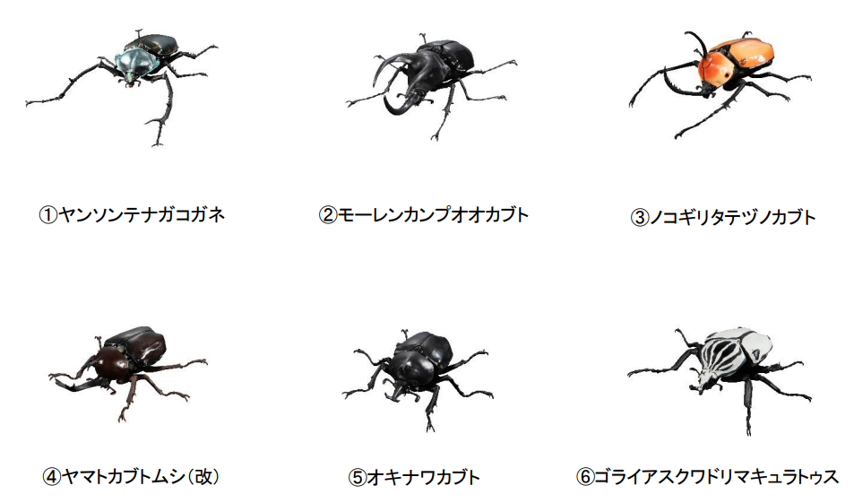 | ラインアップ | 全 6 種 ①ヤンソンテナガコガネ ②モーレンカンプオオカブト ③ノコギリタテヅノカブト ④ヤマトカブトムシ(改) ⑤オキナワカブト ⑥ゴライアスクワドリマキュラトゥス |