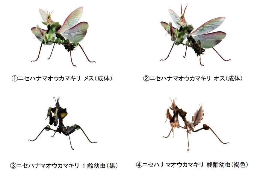 | ラインアップ | 全 4 種 ①ニセハナマオウカマキリ メス(成体) ②ニセハナマオウカマキリ オス(成体) ③ニセハナマオウカマキリ 1 齢幼虫(黒) ④ニセハナマオウカマキリ 終齢幼虫(褐色) |