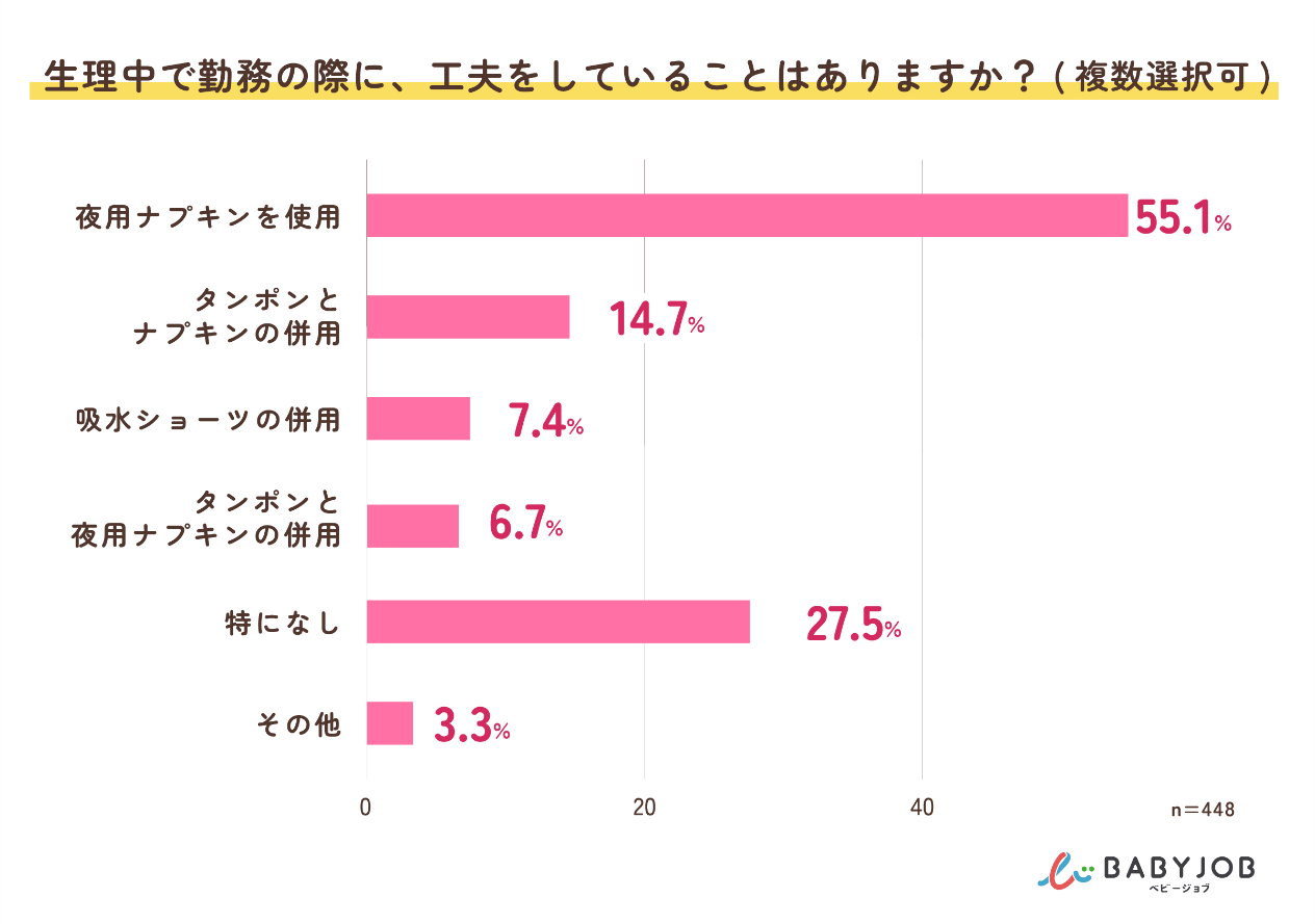 勤務中は自由にナプキンの交換をすることができないため、「夜用ナプキンを使用」、「タンポンとナプキンの併用」などの工夫をしている保育士が多数いることもわかりました。