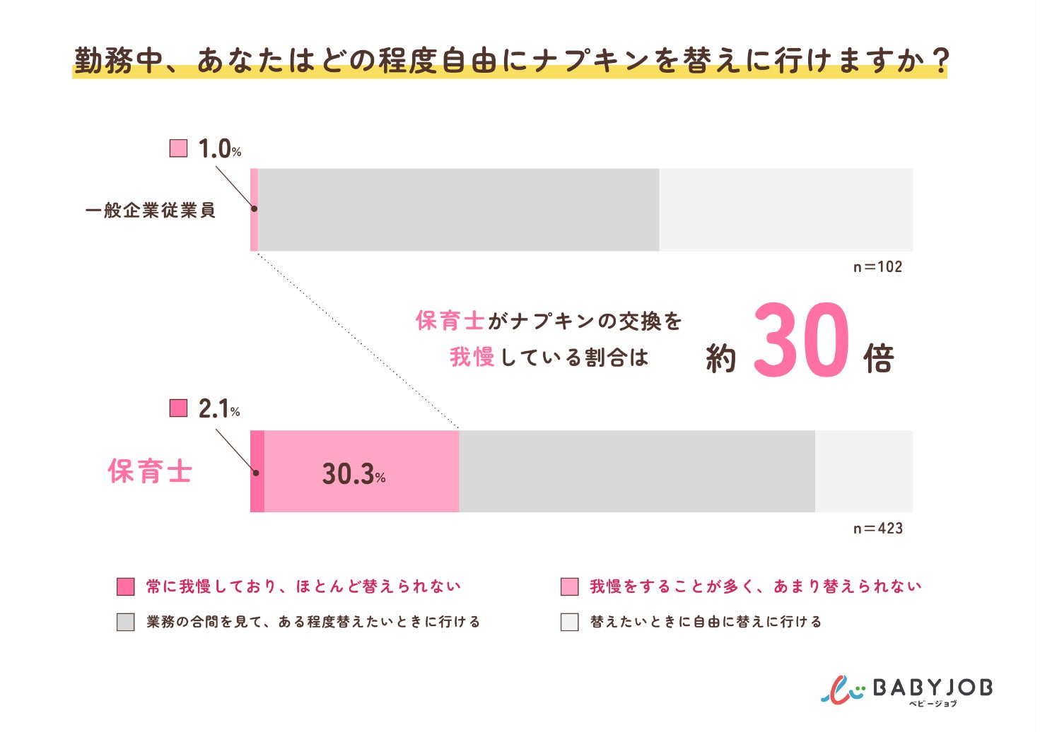 その結果、保育士の3人に1人(32.4%)が「ナプキンの交換を我慢している」と回答したことが明らかになりました。また、一般企業に勤める女性従業員(1.0%)と比較すると、約30倍も高いことが分かりました。