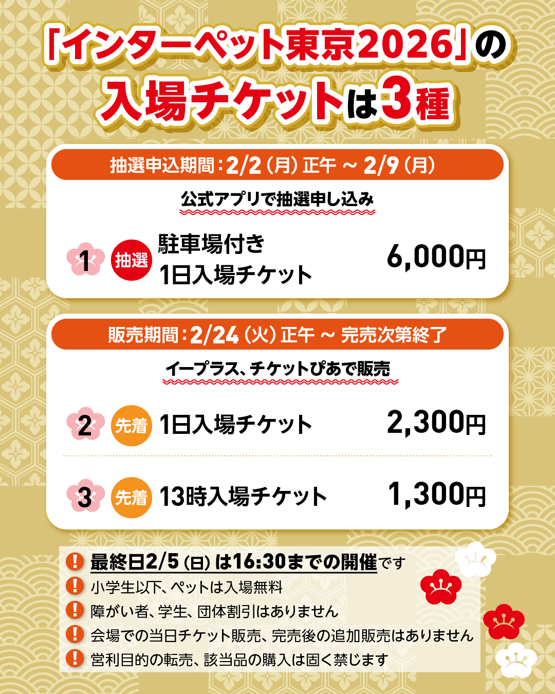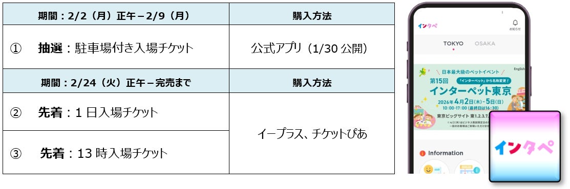 日本最大級のペットイベント「インターペット」は「インターペット東京」と名称を改め、2026年4月2日(木)-5日(日)の4日間、東京ビッグサイト東館で開催します。入場チケットは3種類を用意。「駐車場付き1日入場チケット」は抽選販売とし、1月30日(金)公開予定の一般来場者向け公式アプリ「インタペ」から申し込めます。公式アプリは、会場マップや出展者情報をスマートフォンで手軽に確認できる便利な情報ポータルとして機能します。1日入場チケットと13時入場チケットは、昨年同様にイープラスとチケットぴあで販売します。