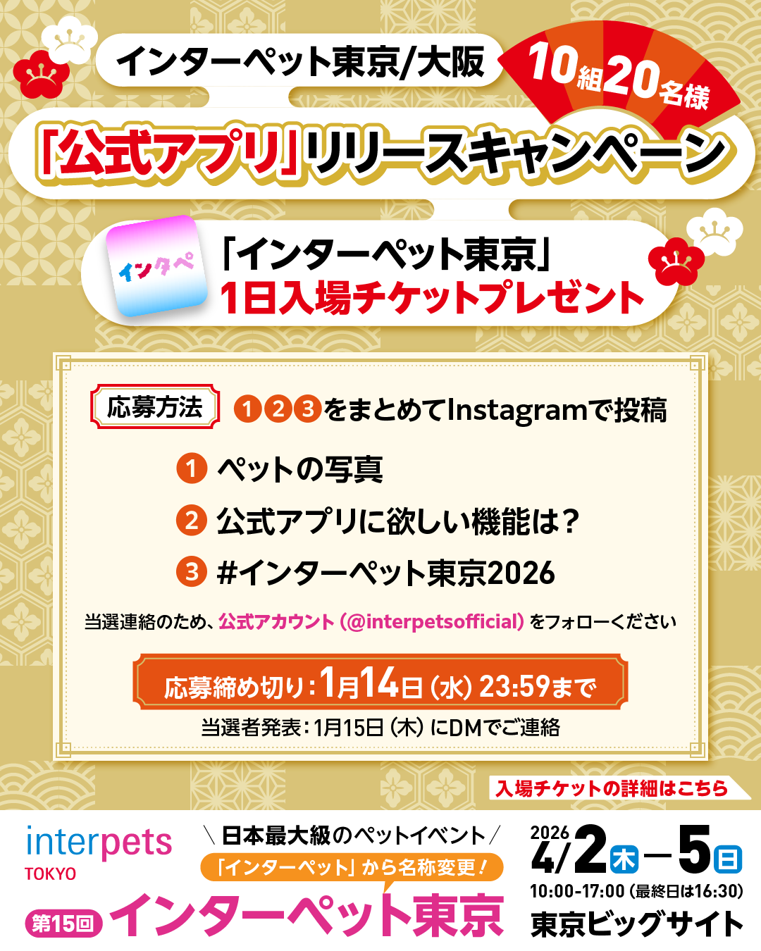 これに先立ち、公式インスタグラムでは「公式アプリリリースキャンペーン」を実施しています。(1)ペットの写真、(2)アプリに欲しい機能、(3)ハッシュタグ「#インターペット東京2026」をまとめて投稿すると、抽選で10組20名様に1日入場チケットが当たります。応募受付は1月14日(水)まで。入場チケットの購入方法やイベントの詳細は、1月15日(木)より特設サイトで公開されます。