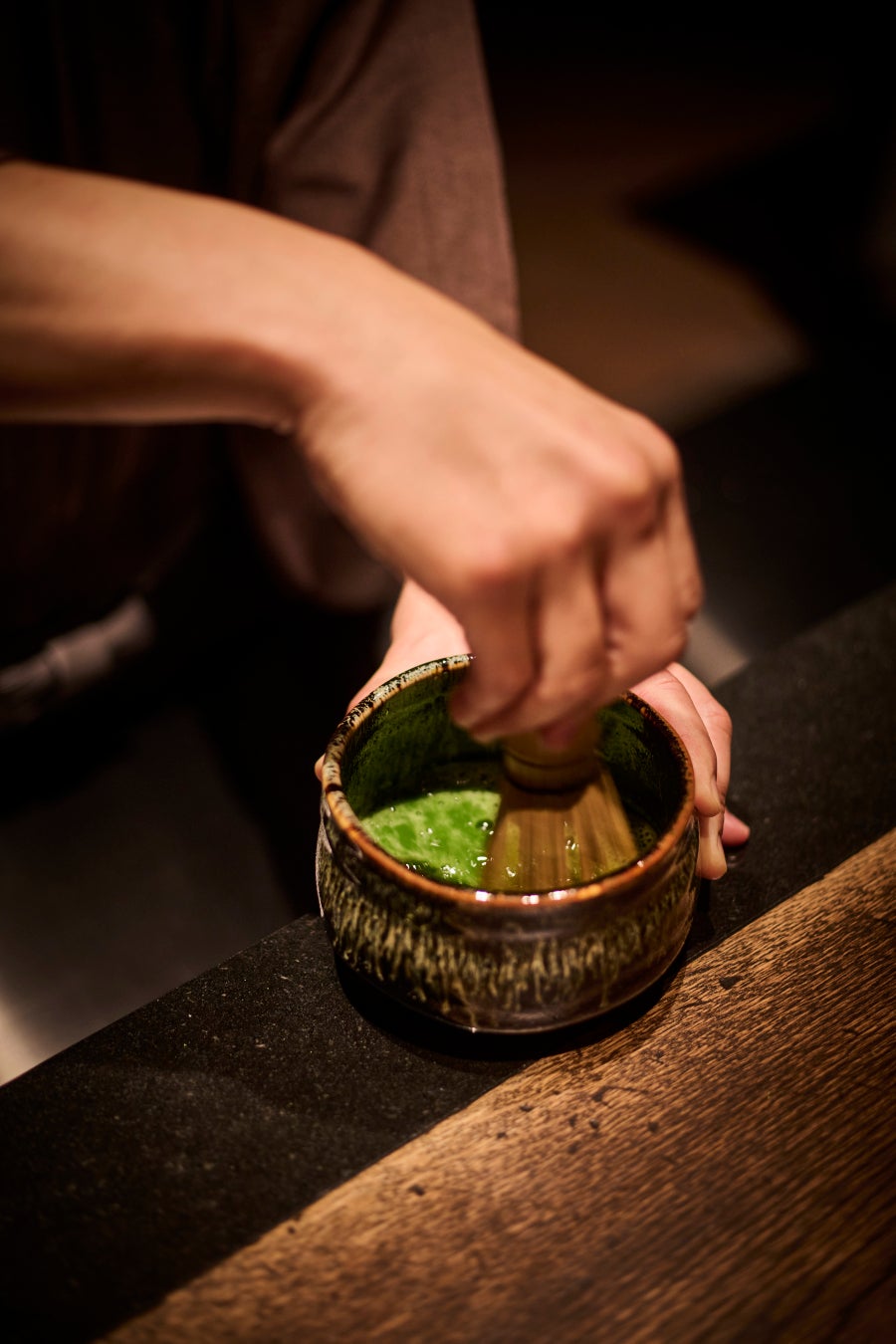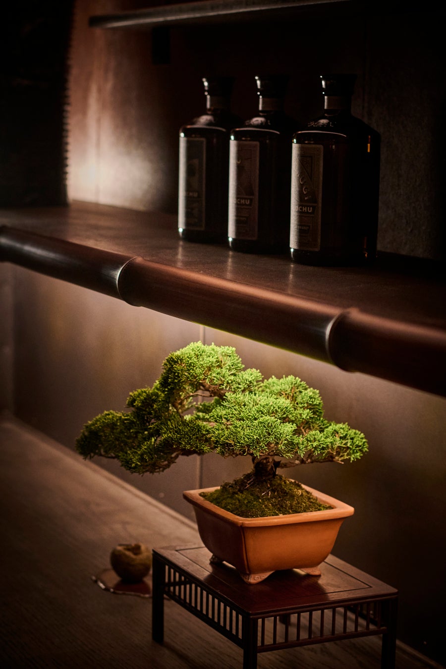 酒造りの神様、奈良の大神神社(おおみわじんじゃ)で作られた杉玉が迎える入口と、屋久杉とオークが随所に使われたバースペース。和の要素をベースにしつつ、異国感漂う煉瓦作りの壁面や個性的なアート作品が配置された店内は、それ自体がテロワール×テロワールというコンセプトを体現するかのように創造的な佇まいです。この凛とした雰囲気と少人数制のバーが、コースの始まりから終わりまでリラックスした集中を促し、カクテル体験をより深く豊かなものにします。