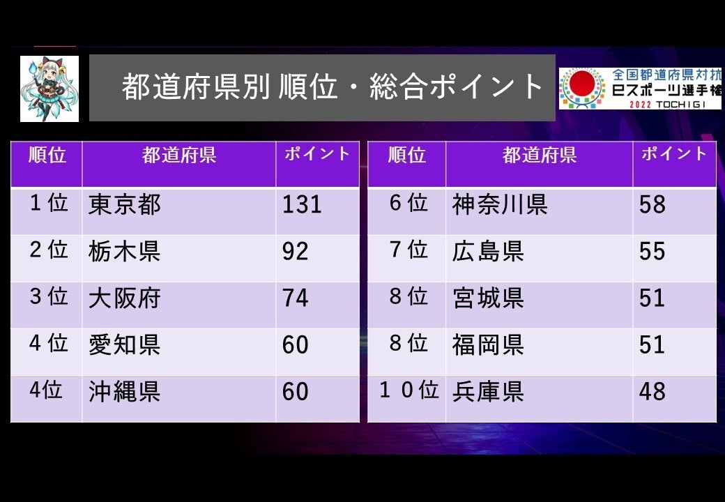 一般社団法人日本eスポーツ連合(会長:岡村秀樹 以下、JeSU)は、10月15日(土)より開幕した、「全国都道府県対抗eスポーツ選手権 2022 TOCHIGI」について、大会初日終了時点の総合成績をお知らせします。