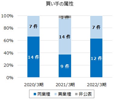 M&A取引件数における買い手の属性を見てみると、2021/3期は他の期に比べ、異業種企業による買収が多いことが分かります。