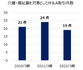 2019年4月1日〜2022年3月31日の3年間(以下、本調査期間)(※1)で公表されたM&A案件のうち、「介護・福祉業」関連企業を対象としたM&A取引件数を調査した結果、2020/3期は21件、2021/3期は24件、2022/3期は19件でした。本調査期間におけるM&A取引件数はコロナ発生前後で大きな変化はなく、安定的な件数推移となっていました。