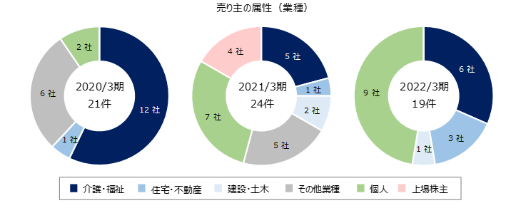 売り手の属性を見てみると、売却対象事業と同種の介護・福祉業を営む企業は一定割合存在するものの、2021/3期~2022/3期にかけては、「個人」の売却案件が多い傾向にありました。介護・福祉業は創業者個人が比較的小規模に介護事業所や福祉用具事業所を営んでいる場合も多く、コロナの影響を受けて財務体力が低下したことで大手企業へ売却し、スケールメリットを生かすことにより事業効率化を図るケースが多かったのではないかと推察します。