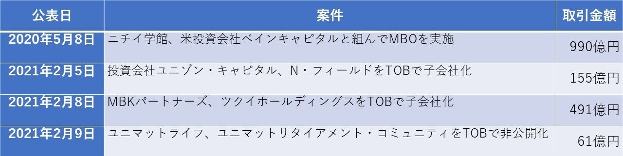 ●2021/3期は、上場会社の非公開化案件が4件と最多件数。その内、介護・福祉業を代表する大手ニチイ学館、N・フィールド、ツクイホールディングスが投資ファンド傘下に。