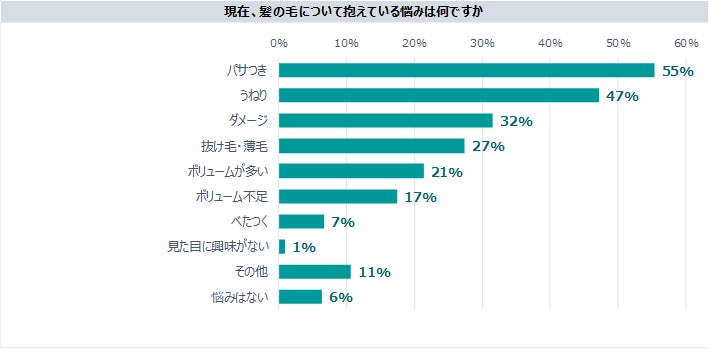 「現在、髪の毛について抱えている悩みは何ですか?」とアンケートした結果、1位は「ぱさつき」でした。
