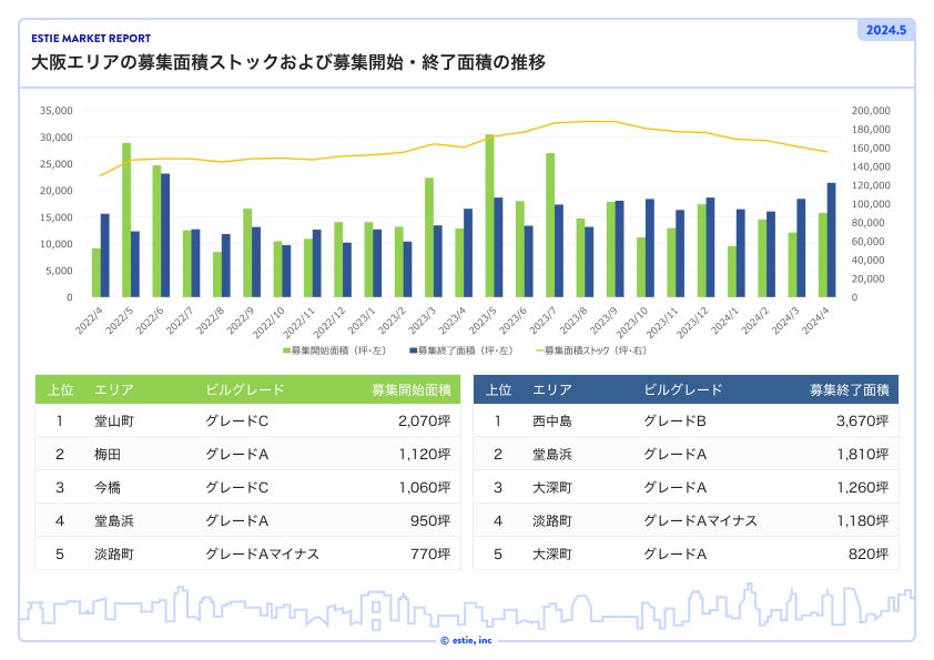 大阪エリアでは、募集開始面積が前月比約30.6%増の15,785坪、募集終了面積が前月比約16.3%増の21,413坪、募集面積ストックは前月比約3.5%減の約155,633坪となり、新規供給が前年・前月比ともに増加していますが、それ以上に大規模区画が複数あった影響も大きく、募集終了面積が増加しているため、募集面積ストックが減少しています。