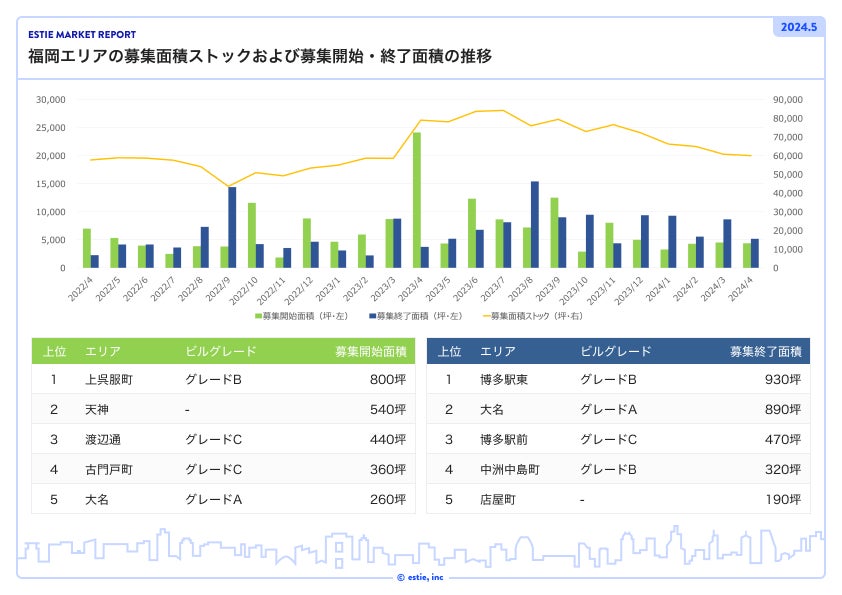 福岡エリアでは、募集開始面積が前月比約3.4%減の4,377坪、募集終了面積が前月比約40.0%減の5,183坪、募集面積ストックは前月比約1.3%減の約59,937坪となり、前年比では各面積ボリュームは減少しており、天神エリアにおける大規模供給による募集開始・終了の増加も落ち着き、募集面積ストックも減少傾向を継続しています。