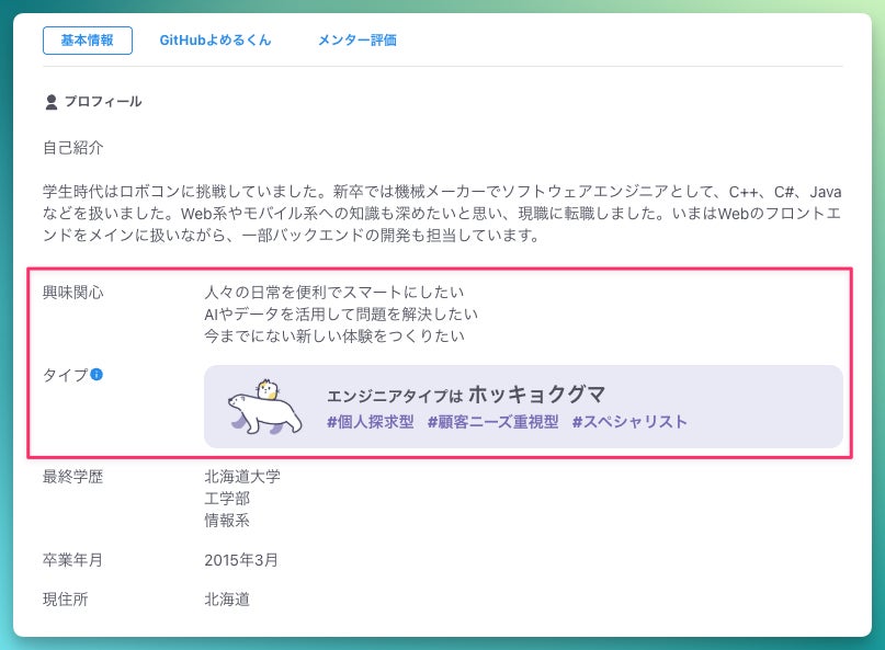 この新機能は、採用文脈でヒアリングされるような質問項目とその回答結果を分析した、データに基づく定性情報を提供することで、より効果的なマッチングを可能にします。たとえば、興味関心の情報は企業のドメインとの相性を示唆しています。「安心・安全に暮らせる社会を作りたい」という回答があれば、このエンジニアはセキュリティ系・インフラ系・ヘルスケア系などの分野であれば前のめりになる可能性が高いと考えることができる、などです。
