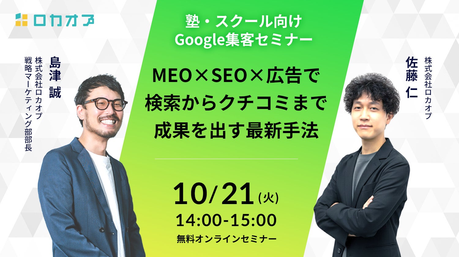株式会社ロカオプ(本社:東京都新宿区新宿 代表取締役:縣将貴、以下:ロカオプ)は、10月21日(火)14:00より無料のオンラインセミナー『塾・スクール向けGoogle集客セミナー ~MEO×SEO×広告で検索からクチコミまで成果を出す最新手法~』を開催いたします。
