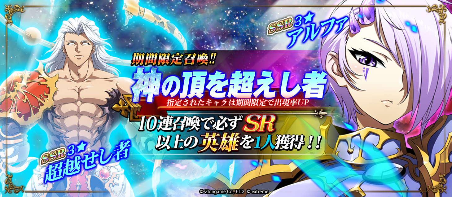 『神の頂を超えし者』は10連召喚で必ずSR以上の英雄を一人獲得できる、期間限定召喚です。SSR超越せし者、SSRアルファの出現確率が期間限定でアップします。