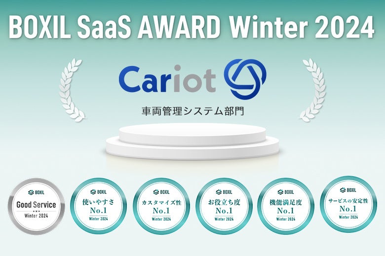株式会社キャリオット(本社:東京都港区、代表取締役社長 齋藤 洋徳)は、今最も評価されているSaaS(※)を表彰する「BOXIL SaaS AWARD Winter 2024」において、当社の車両管理・動態管理サービス「Cariot」が車両管理システム部門の「Good Service」「使いやすさNo.1」「カスタマイズ性No.1」「お役立ち度No.1」「機能満足度No.1」「サービスの安定性No.1」に選出されました。