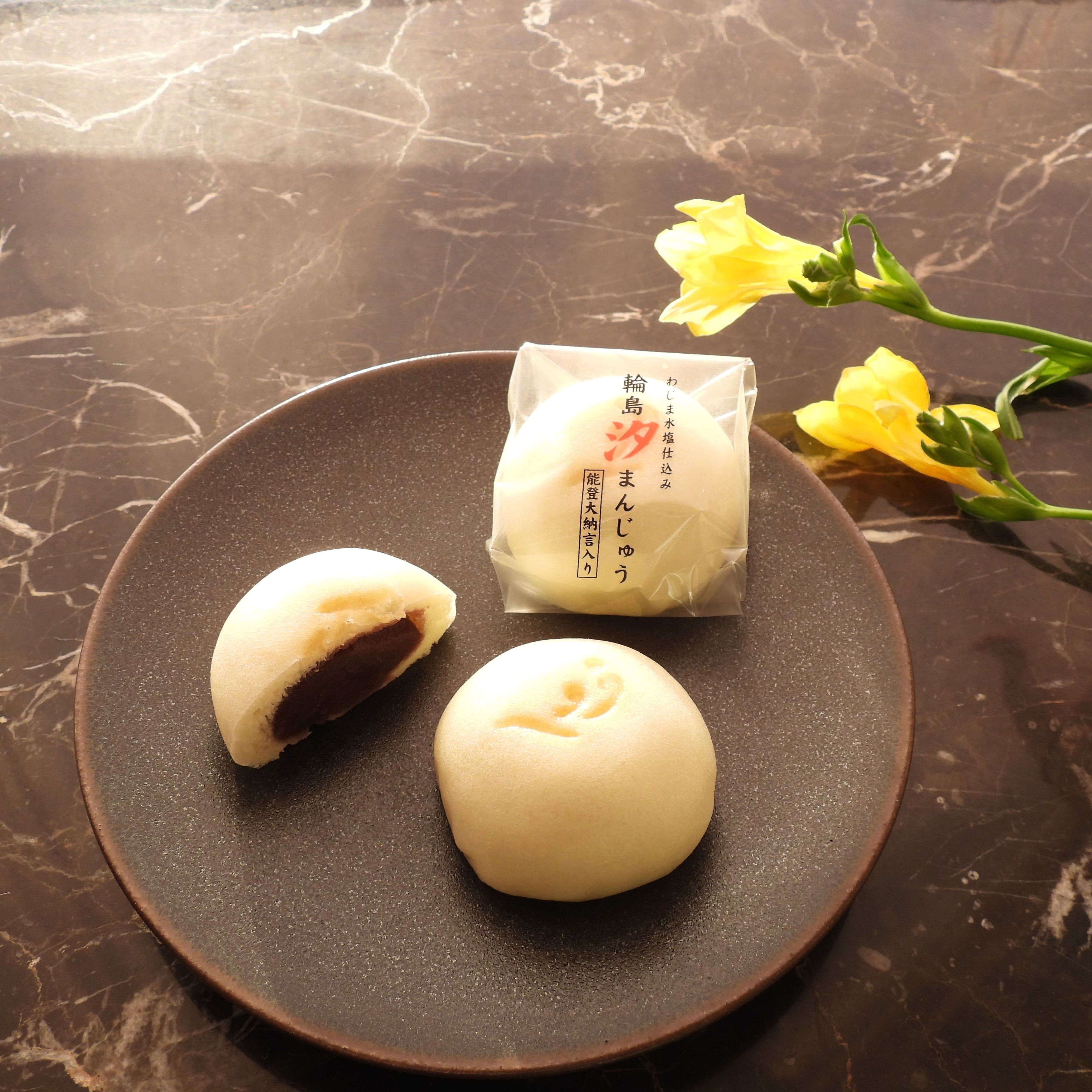 大粒で希少な能登大納言小豆の餡を使い、海水を濃縮した輪島産の液体の塩「水塩」で味を調えました。しょっぱさとあんの甘みがナイスバランスで、塩気がお饅頭の甘みを引き立てます。