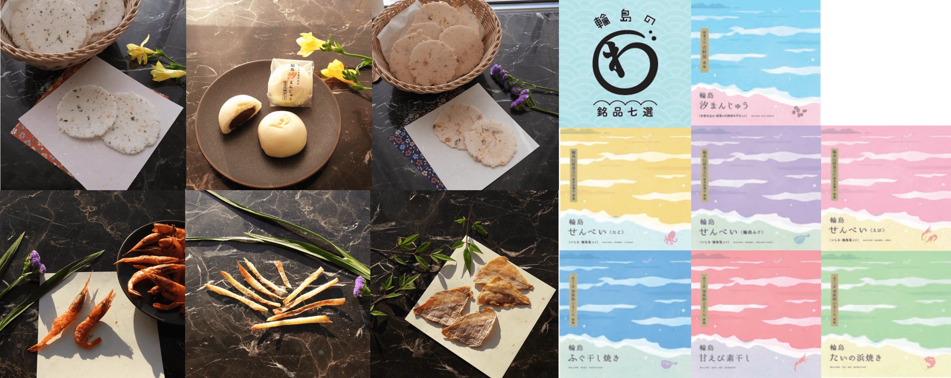 ②能登の里山里海の素材を使用したせんべい(輪島ふぐ、えび、たこ)