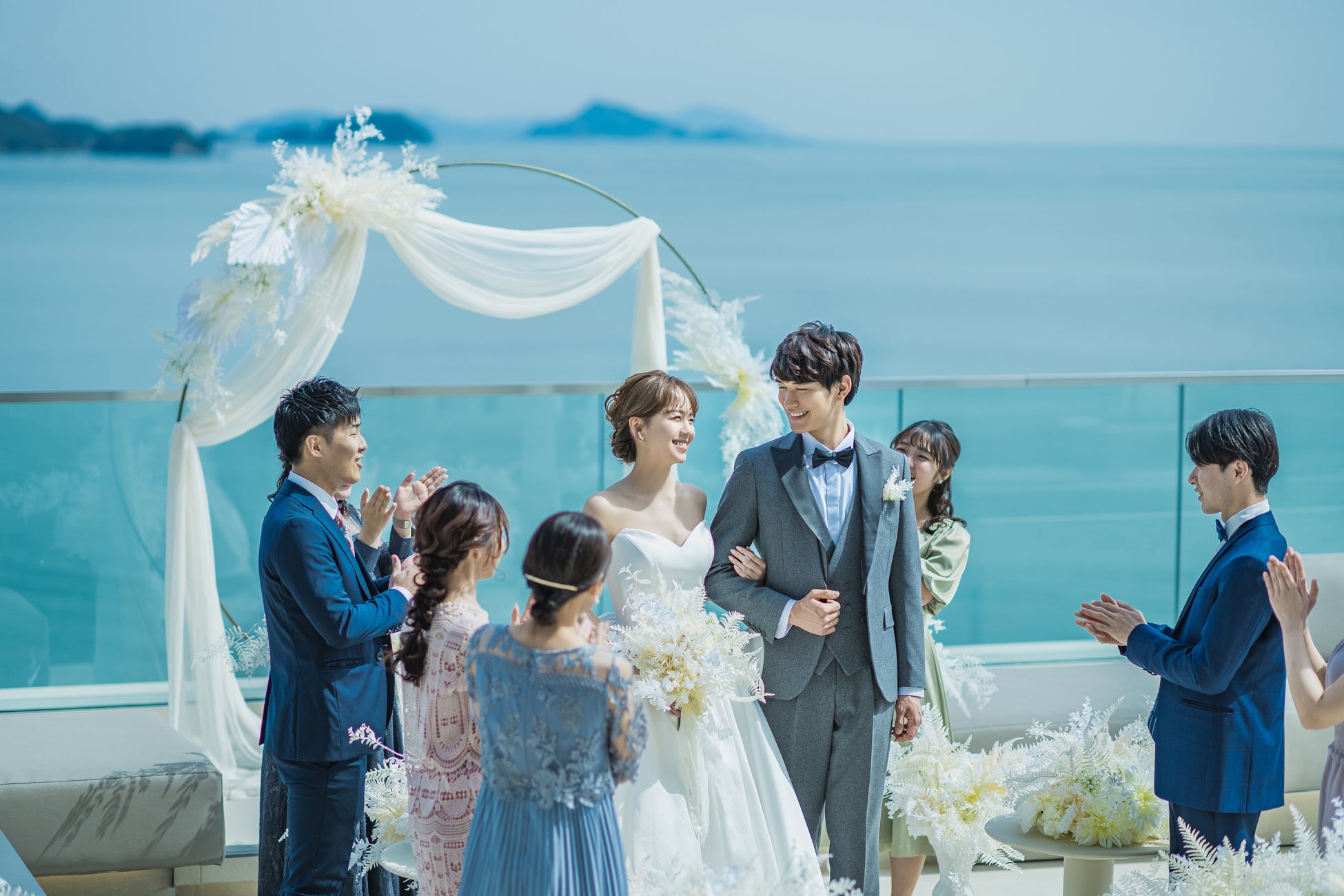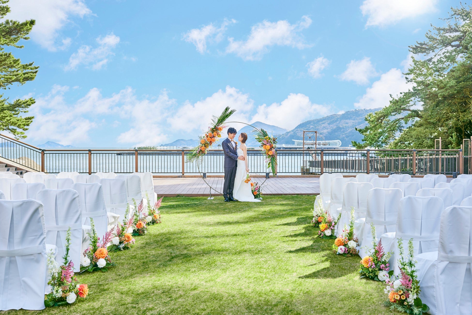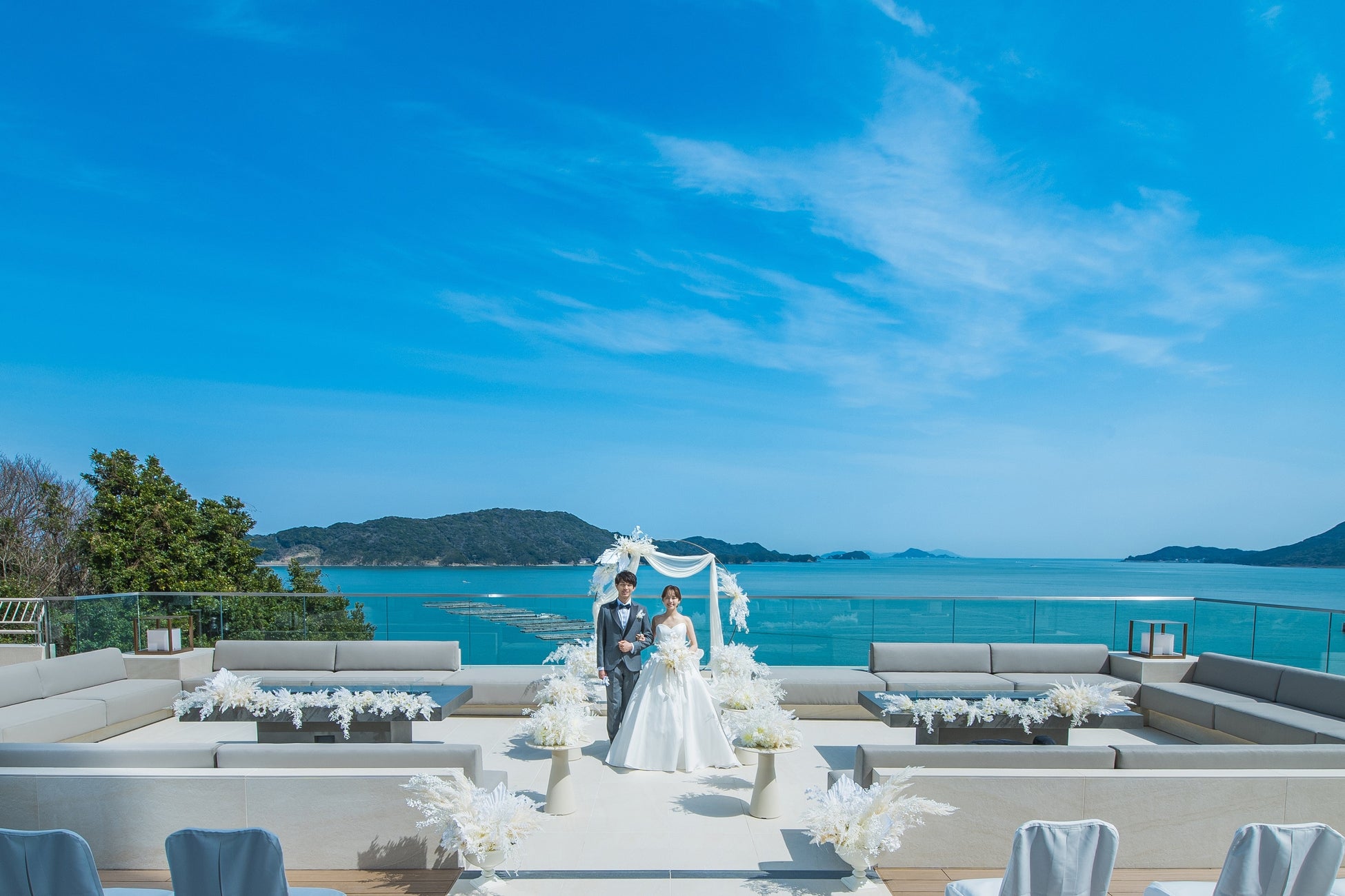 当ホテルが立地する鳥羽湾主水岬(もんどみさき)の突端に、遮るもののない海眺望をお楽しみいただけるラグジュアリーなアウトドアテラス。おふたりの大切な方々と一緒に、パノラミックなオーシャンビューの絶景に囲まれたラグジュアリーな空間での挙式が叶います。