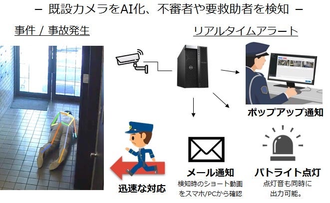 社会インフラや大型商業施設、オフィスビルなどでは、近年防犯対策として多数のカメラが設置されています。人々の安全・安心に対する意識が高まる一方で、増大するカメラ映像に対して映像を監視・確認する人の数は限られており、将来の労働人口減少により監視を担う警備員の減少や人件費の高騰も懸念されています。このような状況のなか、映像解析AIがリアルタイムに異常行動や不審行動を自動で検知・判別することで、警備員の業務を軽減し、省人化できる役割が期待されています。さらには、膨大な映像の中から異常を瞬時に判別・通知し、警備員が即応することにより、犯罪の未然防止や、緊急・救急要請の迅速化に繋がる可能性も秘めています。
