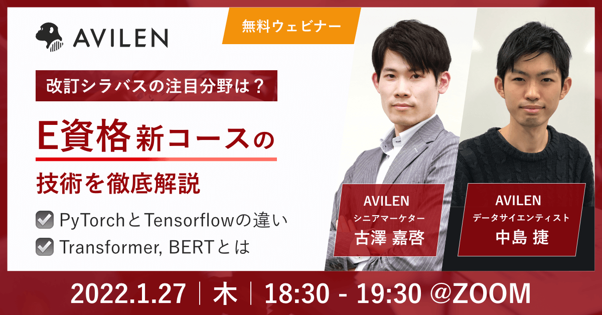 株式会社AVILEN(東京都中央区 代表取締役 高橋 光太郎)は、2022年1月27日(木)に、「PyTorch、BERT・・改訂シラバスの注目分野とは?E資格新コース公開直前ウェビナー」を開催します。