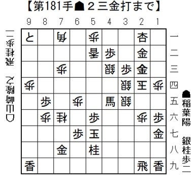 ▲2二歩 △同 銀 ▲7三成桂 △6四飛 ▲7二成桂 △6三飛 ▲7三角成 △同 飛 ▲同成桂 △4二金 ▲6三成桂 △2四歩 ▲7二飛 △2五歩 ▲2四香 △3三銀 ▲2一香成 △5四角 ▲5五桂 △3四銀右 ▲1一成香 △3五桂 ▲7一飛成 △5一歩 ▲6二成桂 △5二金打 ▲3八香 △3六歩 ▲同 金 △4七桂成 ▲同 玉 △3七歩 ▲同 金 △6二金 ▲3五歩 △同 銀 ▲6二龍 △3六歩 ▲2七金 △4五歩 ▲5八桂 △2六桂 ▲3九歩 △4四角 ▲6四龍 △5三銀 ▲7四龍 △3八桂成 ▲同 歩 △2六歩 ▲1七金 △3七歩成 ▲同 歩 △7三歩 ▲5四龍 △同 銀 ▲4五歩 △7一角 ▲7二角 △5二香 ▲4四桂 △同銀上 ▲2一成香 △3二金 ▲4四歩 △3六歩 ▲4三歩成 △3七歩成 ▲同 玉 △4五桂 ▲4八玉 △4三金 ▲同桂成 △5七桂成 ▲同 玉 △4三銀 ▲4二歩 △3二玉 ▲4五角成 △3四銀打 ▲3三歩 △2三玉 ▲2二金 △2四玉 ▲2三金打 まで181手で先手の勝ち