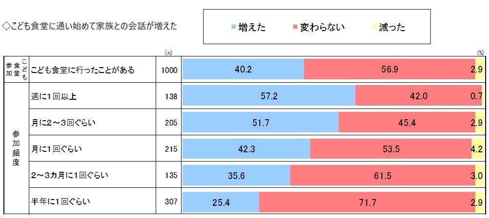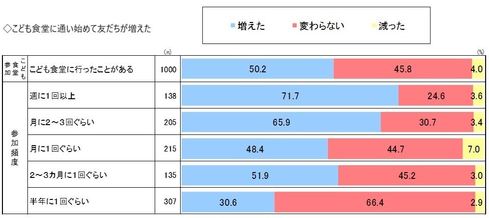 こども食堂に通い始めてからの変化を問う質問では、「笑顔になること」「家族との会話」「友だち」「大人との会話」のすべての項目で、参加頻度が高いほど増加する傾向がありました。