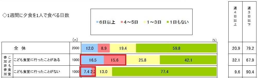 また、夕食を1人で食べる日が週に4日以上あるという参加者が32.1%に対して、非参加者は9.6%と、大きな差がありました。