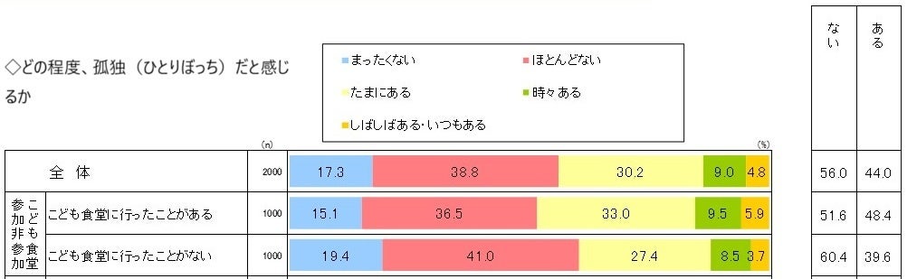 一方、孤独感について尋ねた「どの程度、孤独(ひとりぼっち)だと感じるか」の質問に対しては、参加者の48.4%が感じることがあると回答し、非参加者(39.6%)より高い結果が出ました。