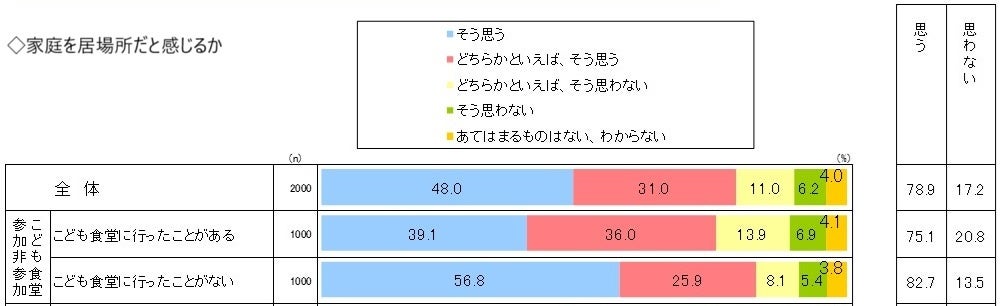 一方、前述の通り、家庭を居場所だと感じるかを尋ねた質問に、「思う」との回答は参加者で75.1%、非参加者で82.7%と、参加者の方が低い結果になりました。