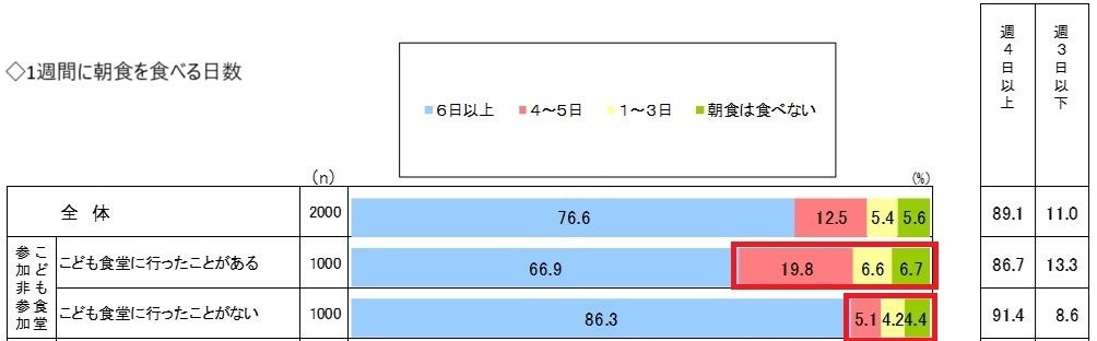 夕食を大人と一緒に食べる日数についても、週に3日以下という参加者が15.2%、非参加者は9.7%と、参加者の方が大人と一緒に食べる機会が少ないという結果になりました。