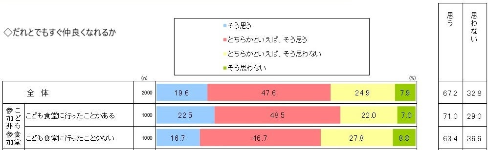 また、社交性について尋ねた「だれとでもすぐに仲良くなれるか」の質問には、参加者の71.0%が「思う」と回答し、非参加者(63.4%)より高い結果になりました。