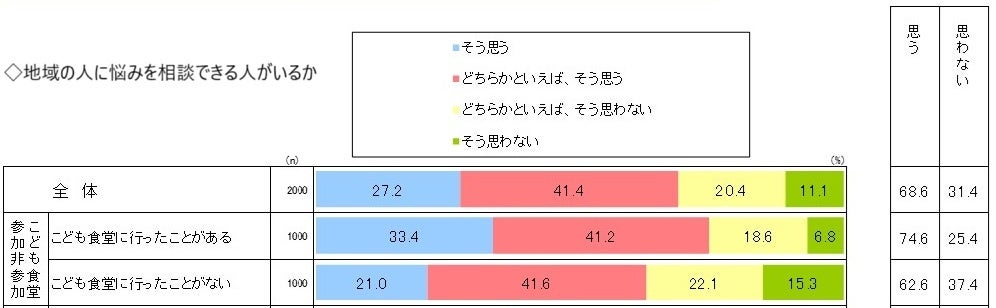 参加者には〈こども食堂で出会った人〉についても質問しました。「悩みを相談できる人がいるか」は71.1%、「困った時は助けてくれる人がいるか」は76.9%が「思う」と回答しました。