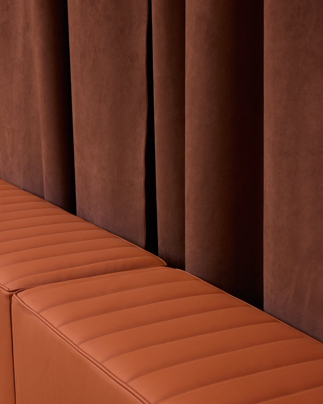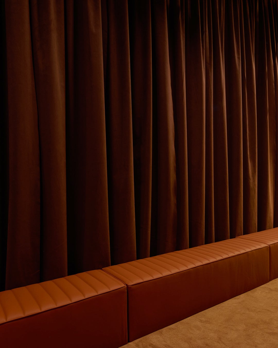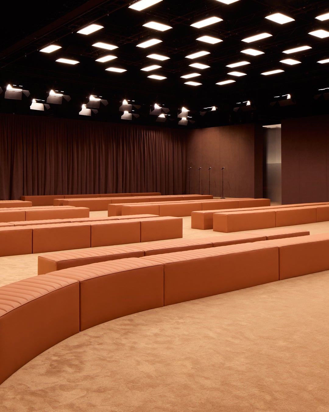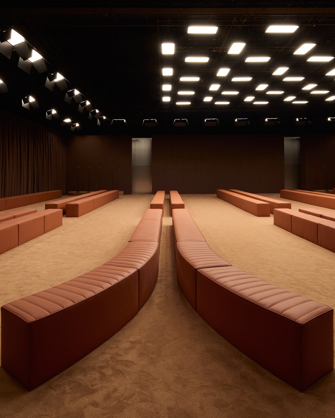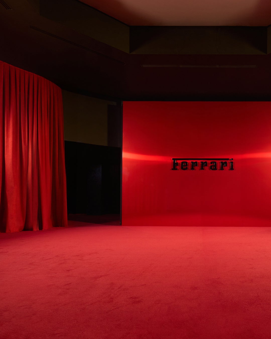 ブランドのDNAに完全に一致する形で、イアンノーネ氏はALCANTARA®を用いて、温かみがあり親密な空間を創り出しました。この空間は、まるでALCANTARA®で内装されたスーパーカーの中からショーを楽しんでいるかのような没入感を提供する設計となっています。ゲストを迎えるのは、アイコニックな「Rosso Corsa」のカーテンであり、「Oud」色のインスタレーションがショーを引き立てています。
