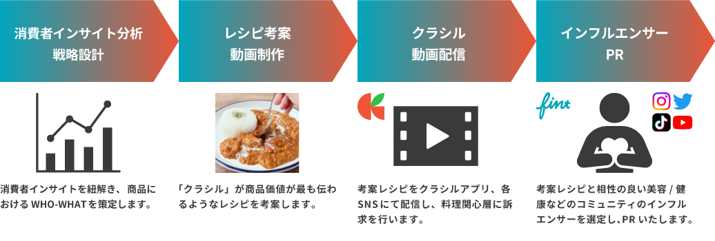消費者インサイトを分析し、商品価値を定義したのち、その価値が最も伝わるようなレシピ考案と動画配信、インフルエンサーPRを行います。レシピ考案は「クラシル」が行い、その拡散は最適なインフルエンサー選定、コンテンツ企画によって実現します。