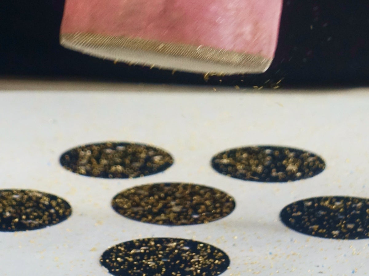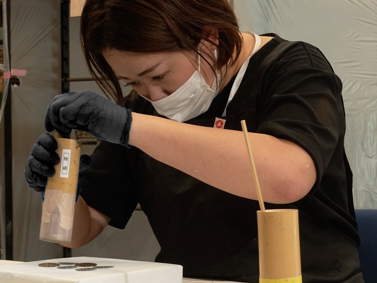 制作を担当したのは、箔装飾職人の宮城理美氏です。20年以上にわたり箔の表現を探求してきた宮城氏は、「小さな文字盤という世界に偶然性と緻密さを共存させることが最大の挑戦だった」と語ります。試行錯誤を繰り返した末、竹筒を振ることで生まれる「偶然性」と一粒ずつ手で置く「必然性」を組み合わせる手法に到達。結果として一点物としての個性を宿しながら、どの個体も同等でバランスのいい箔表現を実現しています。